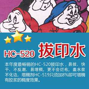 本年度最畅销的HC-520拔印水 ,也是印花行业所说的台面拔印白浆,台面彩拔浆和台面拔印浆等称号,520拔印水具有易拔、快干、不反潮、易增稠,更不会烂布、盖水浆不化边,增稠只需加 8%1 即可增稠有胶浆的稠度效果,是做拔印、彩拔效果的最佳首选材料。