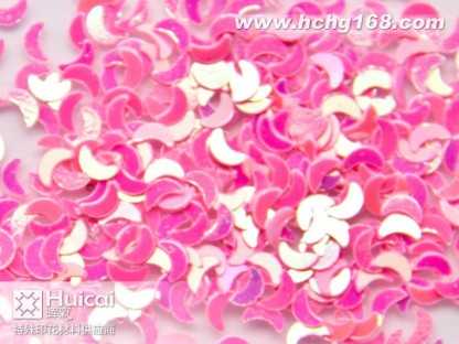 金葱粉:又名闪光片。包括铝质金葱粉,聚酯金葱粉,幻彩粉,镭射金葱粉等。有铝质,PET,PVC材质。大小规格(size)由1/2560、1mm)至1/83、0mm)。形状有六角形,四角形,长条针形和不规则形状,并有多种颜色可供选择。各种材质金葱粉可不同程度承受高温(由80*C,180*C300*C不等) 。