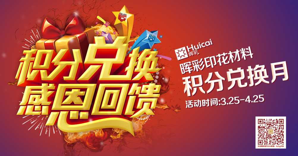 在此辉彩印花材料也把积分兑换月活动从三月二十五延迟到四月二十五;详情加入辉彩公众微信号 hchg168;