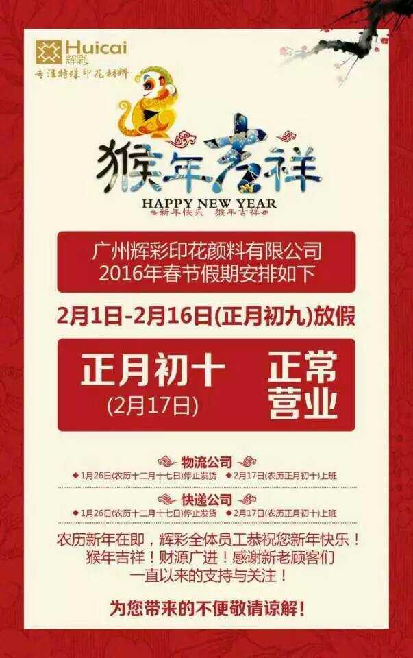 广州辉彩印花材料有限公司2016春节假期通知: