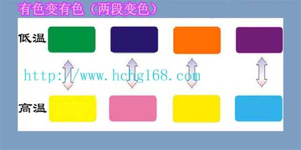 而今辉彩特殊印花材料感温变色粉有了多种颜色,分别是黑色、红色、金红色、朱红色、桃红色、玫瑰红、橘色、黄色、深蓝色、蓝色、天空蓝、土耳其蓝、绿色、黄绿、草绿色、紫罗兰色、等,而且各类颜色跟色彩一样,可以相互混合进行调色。感温变色基本温度:-5℃、0℃、5℃、10℃、15℃、20℃、30℃、35℃、40℃、45℃、50℃、65℃、70℃、73℃。(以30℃黄色为例,变色形式为30℃以上呈现无色透明,30℃以下呈现黄色)