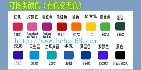 辉彩特殊印花材料感温变色粉系列种类分为感温变色浆、感光变色浆、感温变色粉、感光变色粉、七彩变色龙粉应用范围也较广泛,一般用于涂料、油墨、塑胶等。