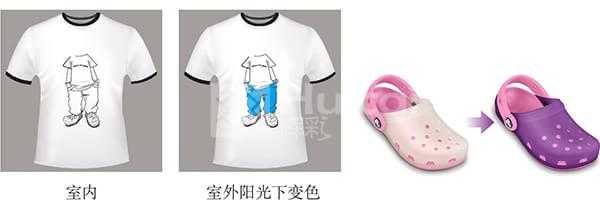 感光变色产品,经阳光/紫外线照射后,能吸收阳光/紫外线的能量,产生分子结构的改变,导致吸收波长的改变,而产生颜色的变化;当失去阳光/紫外线能量后,则回复原来的分子结构,还原成本来的颜色。