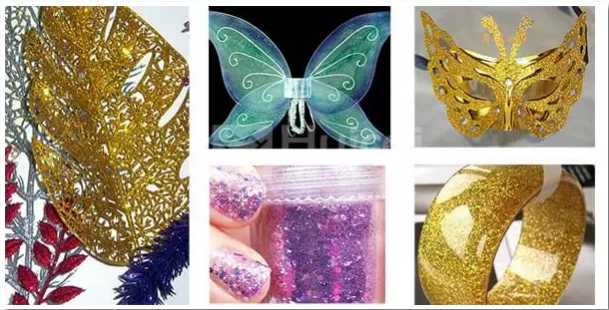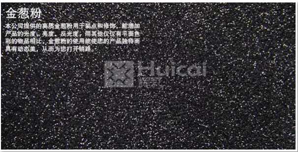 金葱粉可通过注塑,丝印,涂层,喷撒的主式,用于纸,布,木,金属,皮具,塑胶,陶瓷等多种材料上,形成装饰或反光等特殊或醒目的效果。本公司提供的高质金葱粉用于装点和修饰,能增加产品的光度、亮度、反光度,同其他仅仅有平面色彩的物品相比,金葱粉的使用能使您的产品独特而具有动态美,从而为您打开销路。