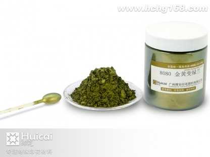 8080金黄变绿兰变色龙粉其变色原理为吸收特定波长之紫外光源,藉由该光源之能量而产生颜色变化(变为紫色、红色、黄色、天空兰色),当特定波长的紫外光源不在时,即恢复原来的颜色。