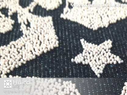 先印辉彩印花材料的HC-800粘珠浆一次吹干打底,然后再印第二次时以胶珠的大小来确定印粘珠浆的厚度,或是印第三次粘珠浆以便留有足够的粘珠浆