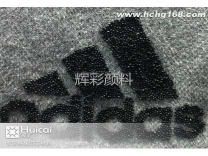 先印辉彩印花材料的HC-800粘珠浆一次吹干打底,然后再印第二次时以胶珠的大小来确定印粘珠浆的厚度,或是印第三次粘珠浆以便留有足够的粘珠浆
