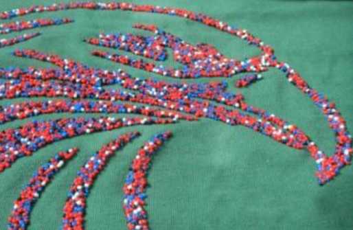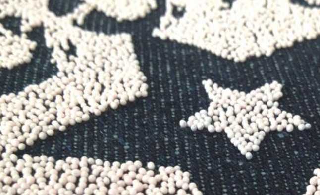 操作工艺:选用80—100目的网纱印刷,每次收刀时稍微轻些,可使下的粘珠浆留在布面上多些,尽量厚些,然后选用玻璃板轻放在印刷好胶珠的面料上微微轻压,自然干透160—180度压烫15秒,使表面膜变成透明,也可使用1-3%固色剂洗水效果更佳,制做半厚版,印刷→撒珠→轻压……