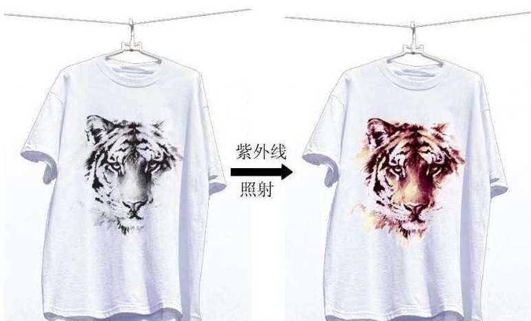 感光变色浆印花工艺广泛应用于文化衫、童装、广告宣传画等,可得到令人意想不到的效果。光变印花工艺与温变印花工艺相结合,加入到您的设计之中,定会使您的产品变化无穷,占领市场先机。