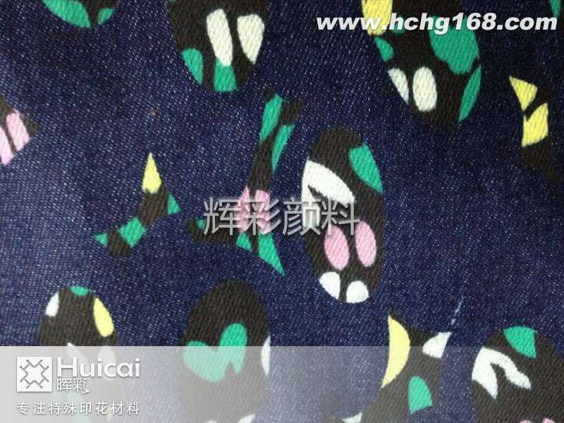 辉彩牛仔布拔白浆料及其在印花牛仔布生产中的应用,属纺织品染色领域。其拔白浆料包括下列重量组分配比的物料:拔白剂:增稠剂:水=1~10:20~60:20~75拔白剂、增稠剂和水搅拌制成稳定混悬态浆料。