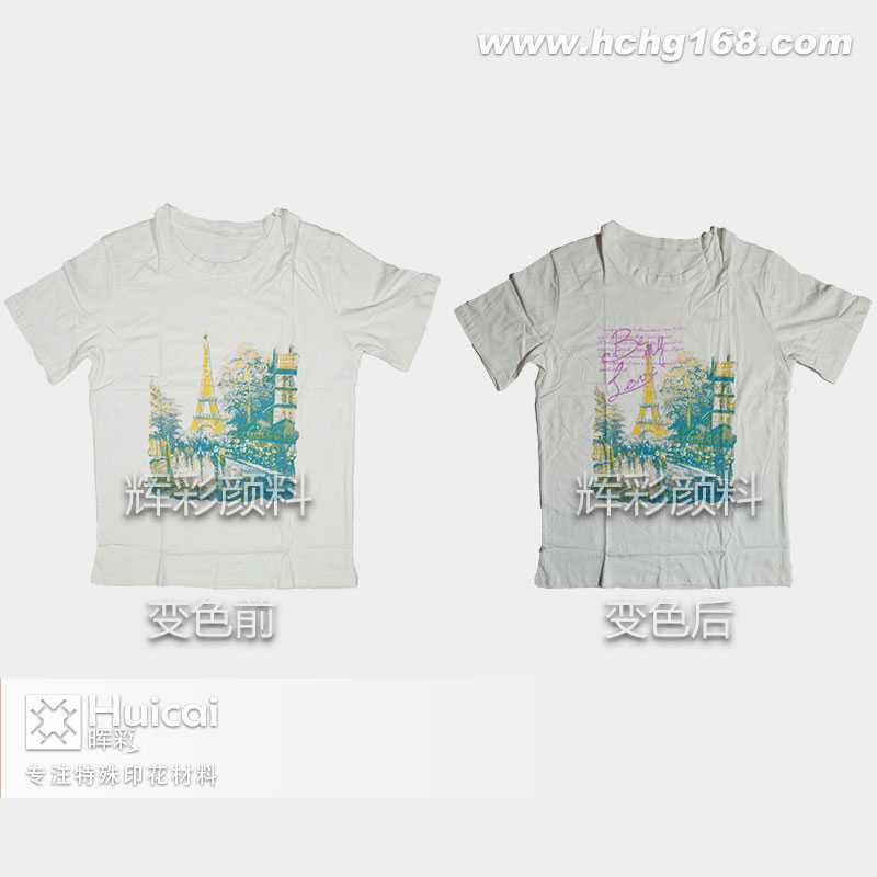 光变粉印花的时候先将光变粉按3—6%左右的比例添加到专用浆里面,充分搅拌了之后,直接印在浅色布上,等自然干。这里要注意的一点是用深色的布一定要白色打底,还有尽量不要用黑色布。