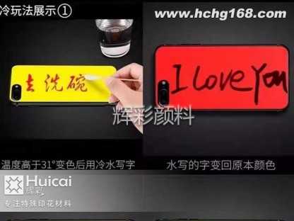 常规的温变粉变色温度为31℃,俗称手摸变色、手感变色,实际上温变粉打造出的手机壳的变色条件只是一个区间,也就是从开始变色到变色结束的温度范围,这个范围一般为4~6℃。除了遇热变色外,当整体温度高于某个区间时,在手机壳上用冷水写字,也能呈现特别的玩法。