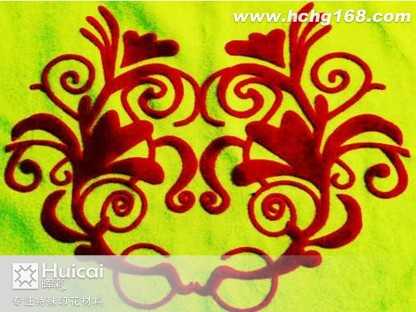 第三步:在印好的图案上合上植绒纸,根据织物厚簿调整好压烫机压力,压力尽量调至最小,温度为150-160度,压烫时间为10-15秒,压烫后必须纸完全冷却后再撕去植绒纸。