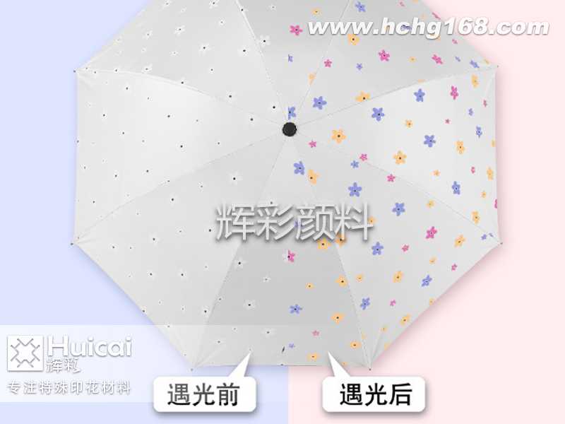 感光变色粉在伞中的使用,突破了传统太阳伞在颜色和图案方面的一层不变的局限性,这种太阳伞在遇到光的时候,伞面就能一点一点浮现出彩色的样子,回到无光的地方之后又回归本色,而且变色可循环,上演遇光变色的魔法,给生活带来更多惊喜。