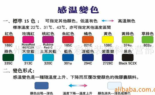 4、感温变色内含微胶囊变色颗粒,粒径在1~10UM之间,并具有耐高温、抗氧化等胶囊所改变的特性。