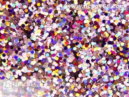 金葱粉:又名闪光片。包括铝质金葱粉,聚酯金葱粉,幻彩粉,镭射金葱粉等。有铝质,PET,PVC材质。大小规格(size)由1/256(0、1mm)至1/8(3、0mm)。形状有六角形,四角形,长条针形和不规则形状,并有多种颜色可供选择。各种材质金葱粉可不同程度承受高温(由80*C,180*C,300*C不等) 。