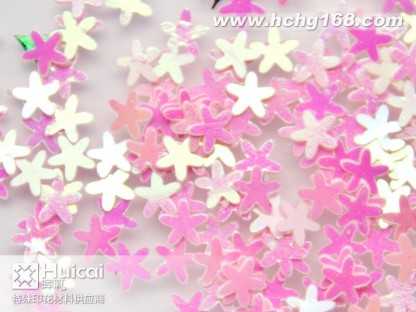 金葱粉:又名闪光片。包括铝质金葱粉,聚酯金葱粉,幻彩粉,镭射金葱粉等。有铝质,PETPVC材质。大小规格(size)由1/2560、1mm)至1/83、0mm)。形状有六角形,四角形,长条针形和不规则形状,并有多种颜色可供选择。各种材质金葱粉可不同程度承受高温(由80*C,180*C,300*C不等) 。