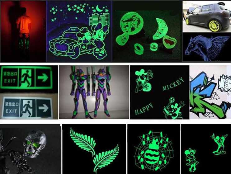 辉彩长余辉夜光粉可用于多种透明或半透明介质中,如塑胶、硅橡胶、POLY树脂、涂料、釉料、油墨、化学纤维等。夜光粉可适用于制备玩具、工艺饰品、硅胶手镯、人造花、显示夜间物体、钟表、电话按键、野外仪器或指示器、电影院座位号码、交通、等等。